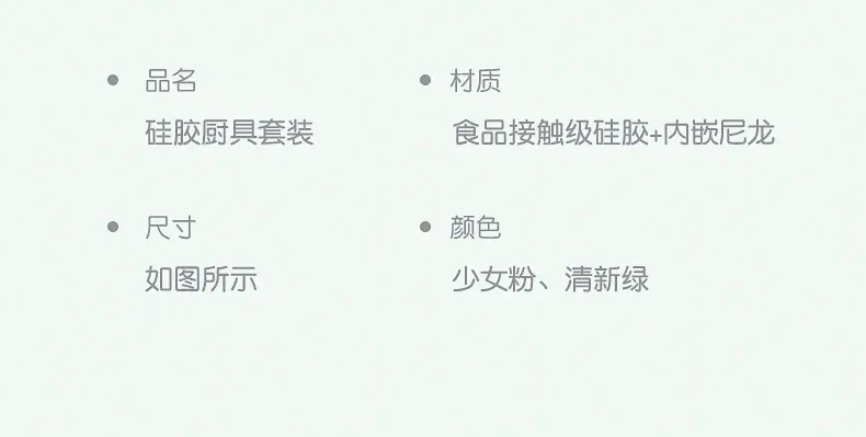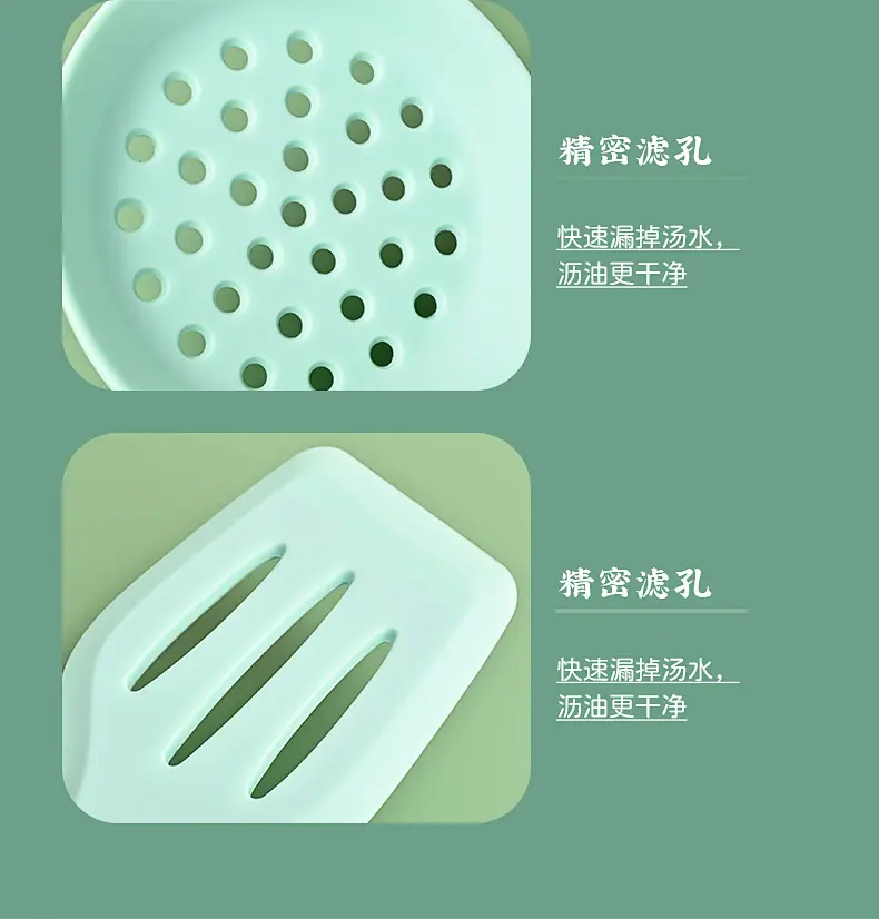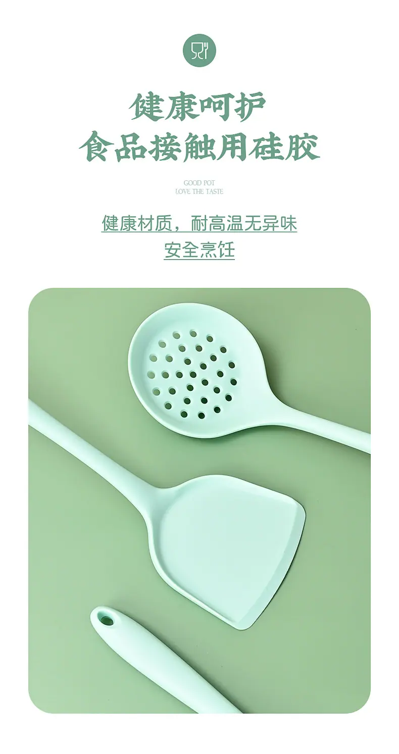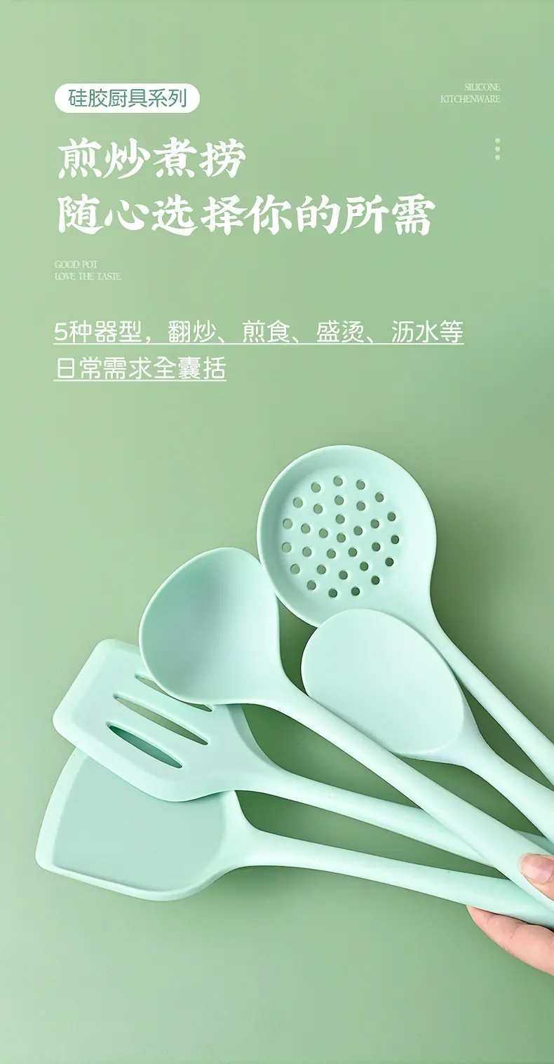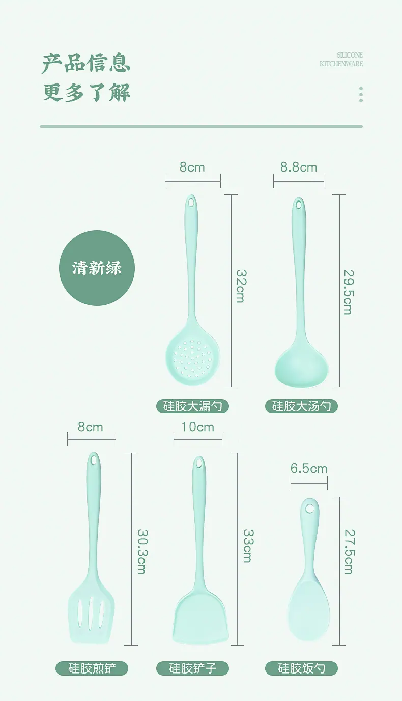 Green spatula, Green spoon, Green colander, Green rice spoon, Green frying spatula, Green oil brush, Green scr...