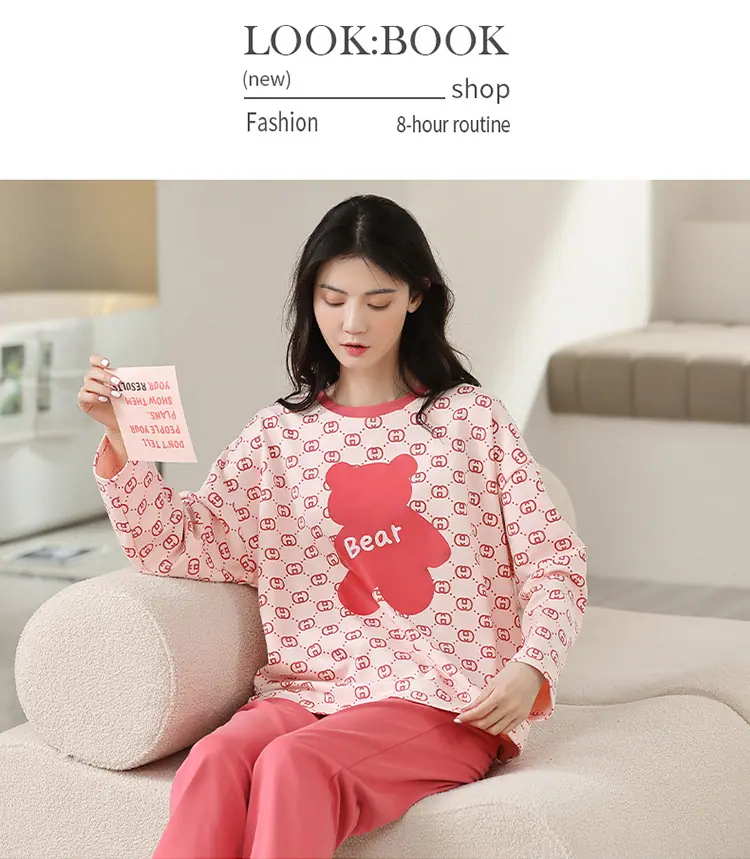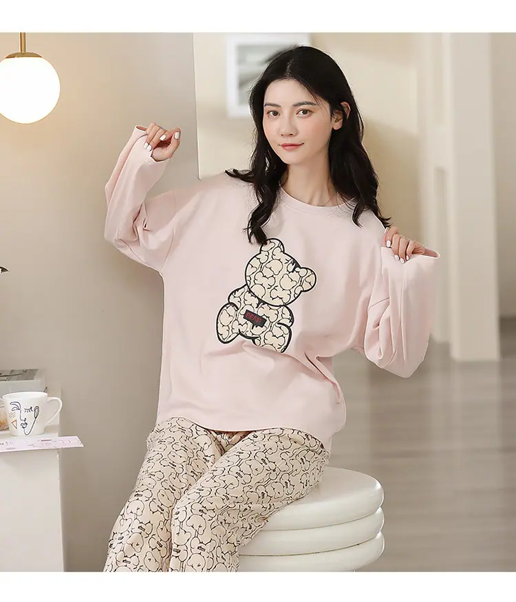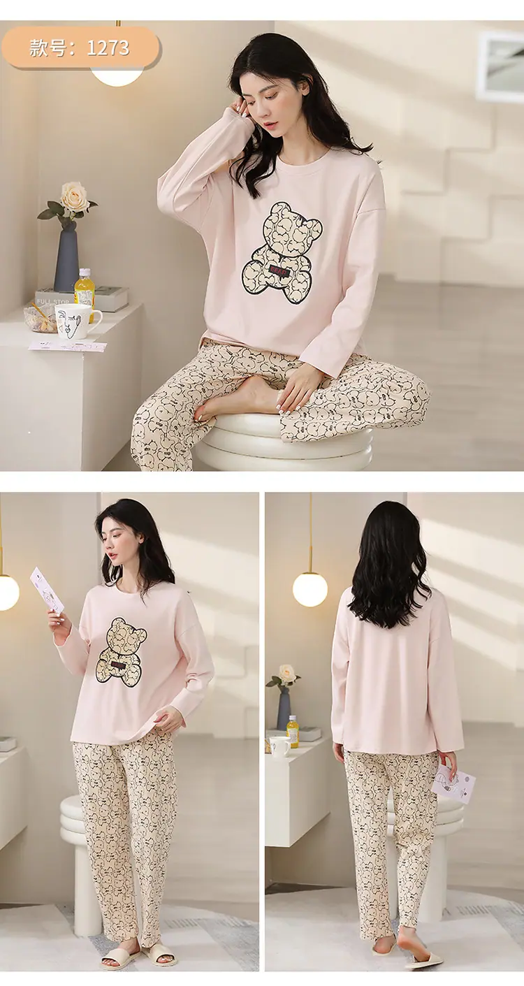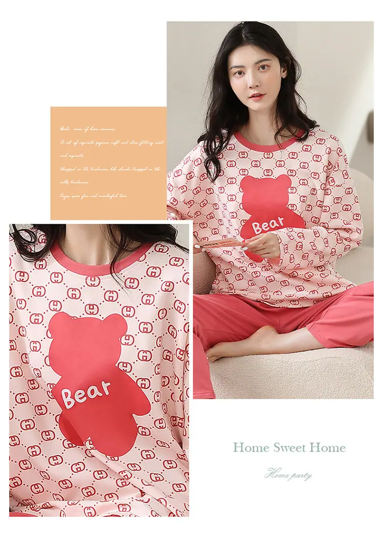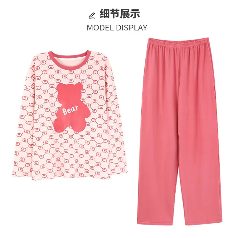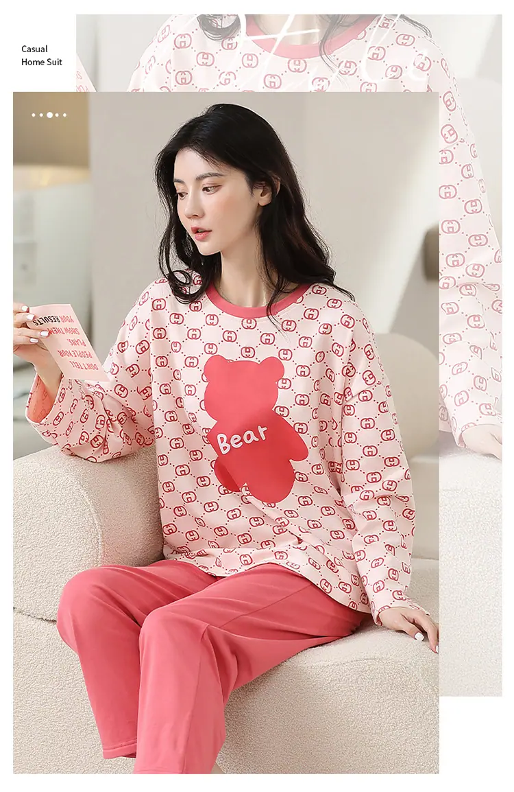Compre Pijama Urso Desenho Animado Feminina Manga Longa Algodão Roupa de Exterior Pulôver Gola Redonda Feminino Algodão Casual Roupa de Casa terno no atacado no Joom.pro