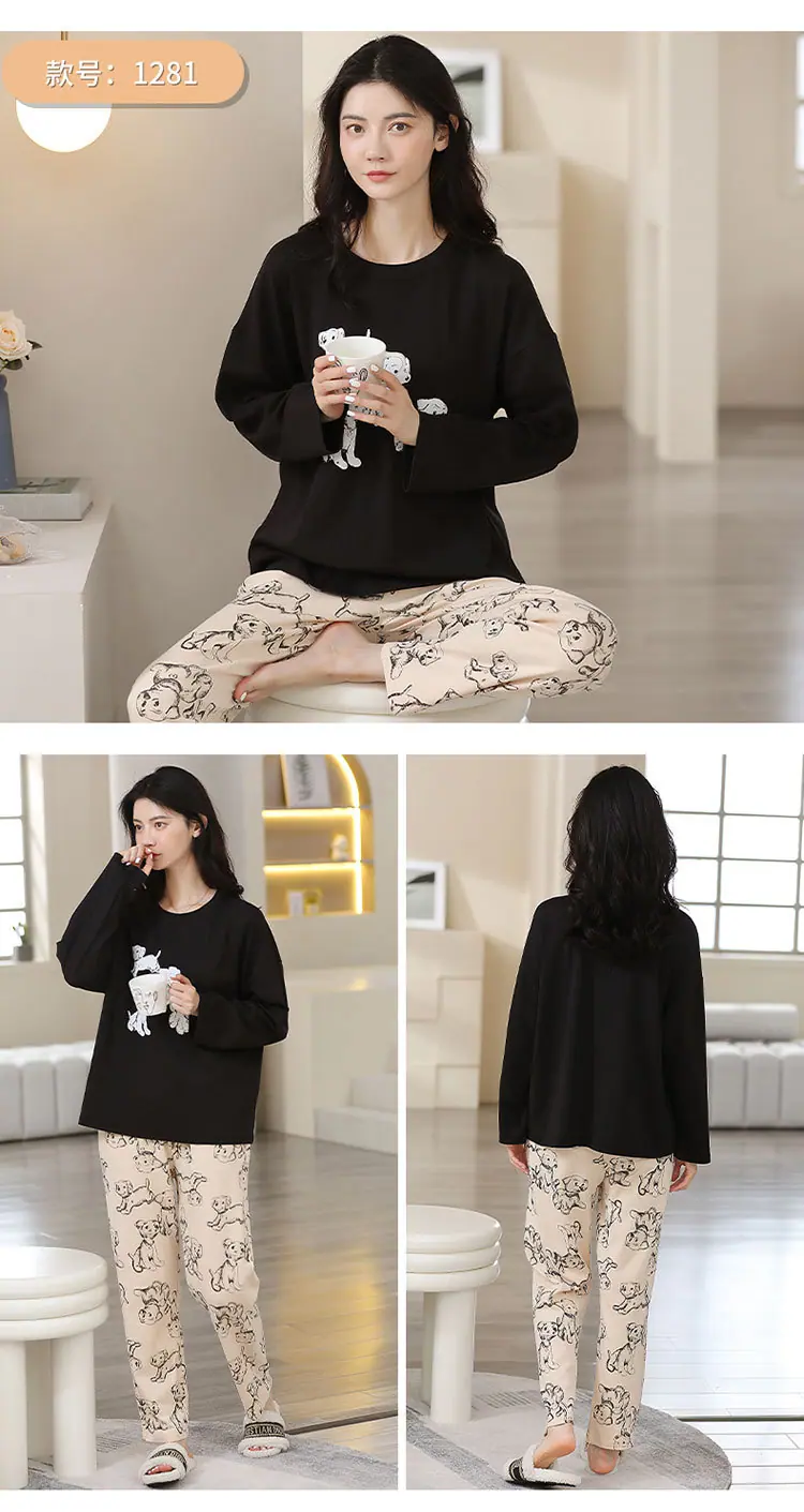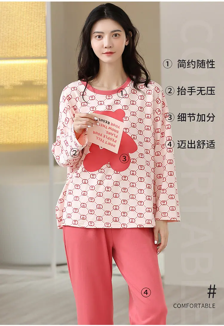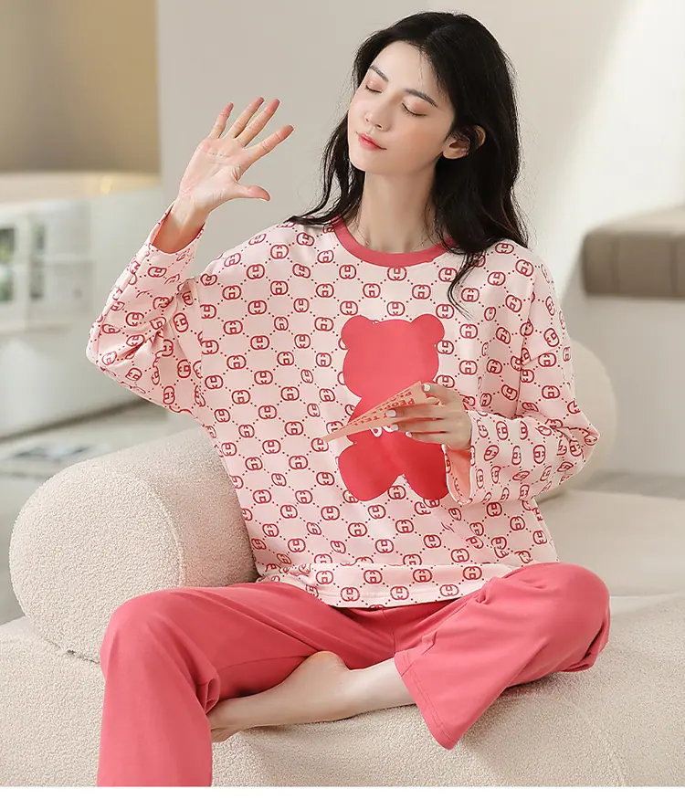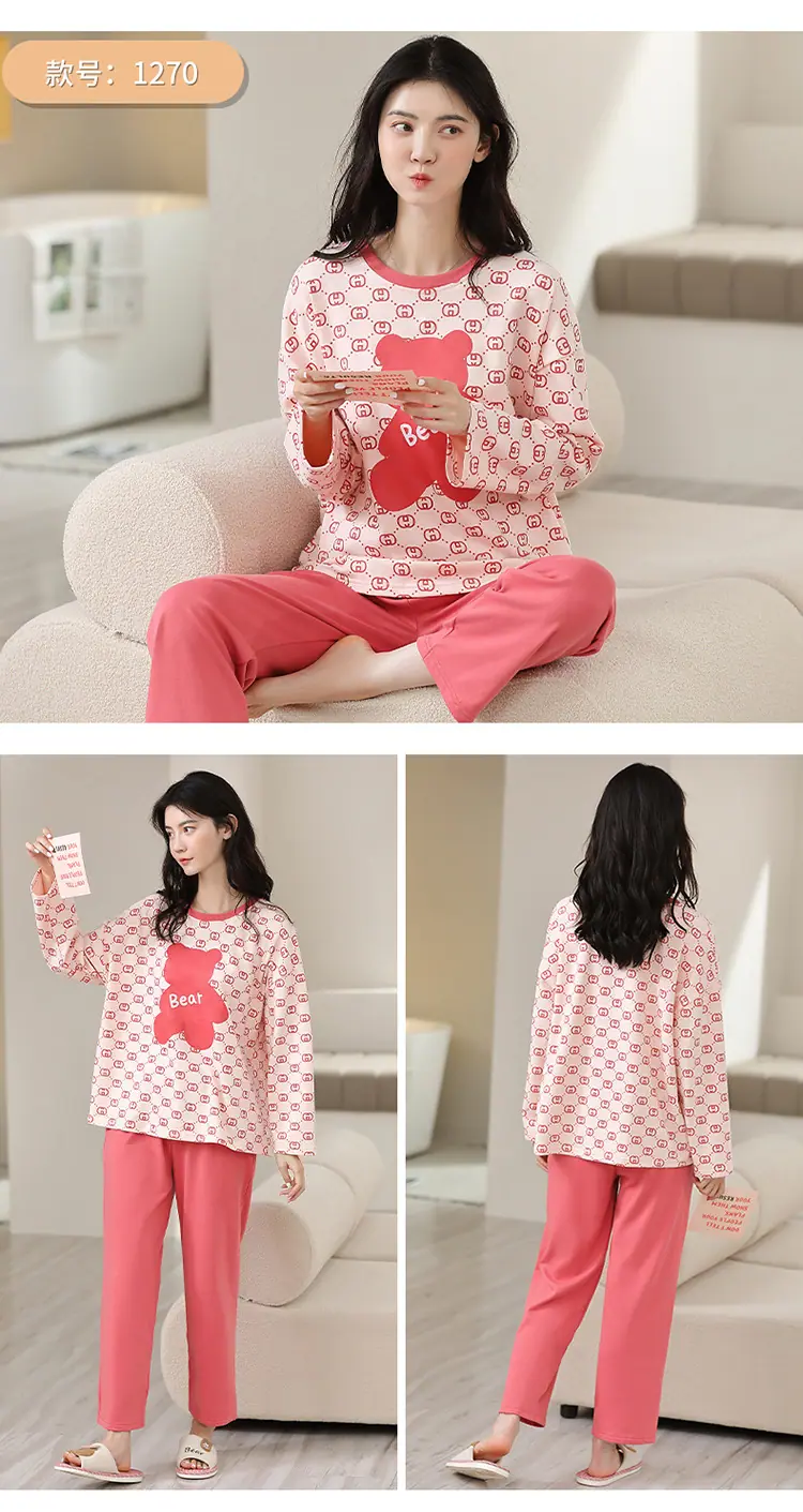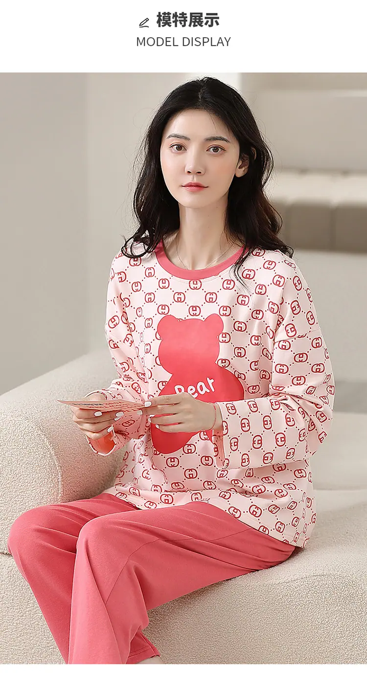 Compre Pijama Urso Desenho Animado Feminina Manga Longa Algodão Roupa de Exterior Pulôver Gola Redonda Feminino Algodão Casual Roupa de Casa terno no atacado no Joom.pro