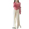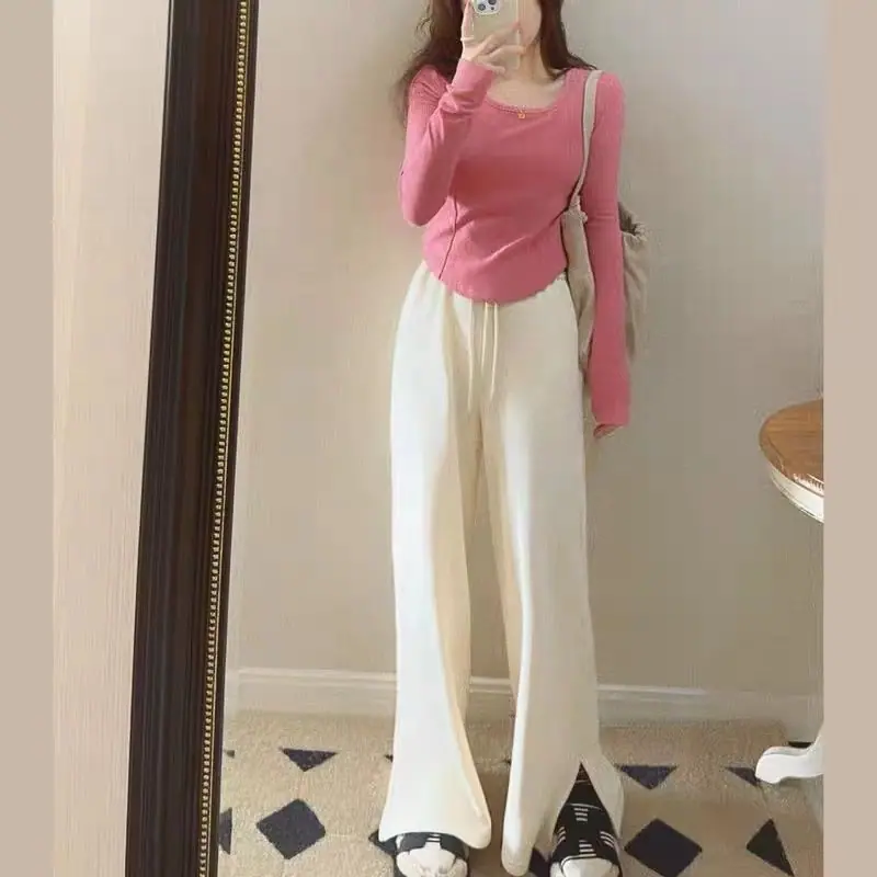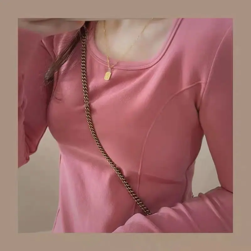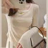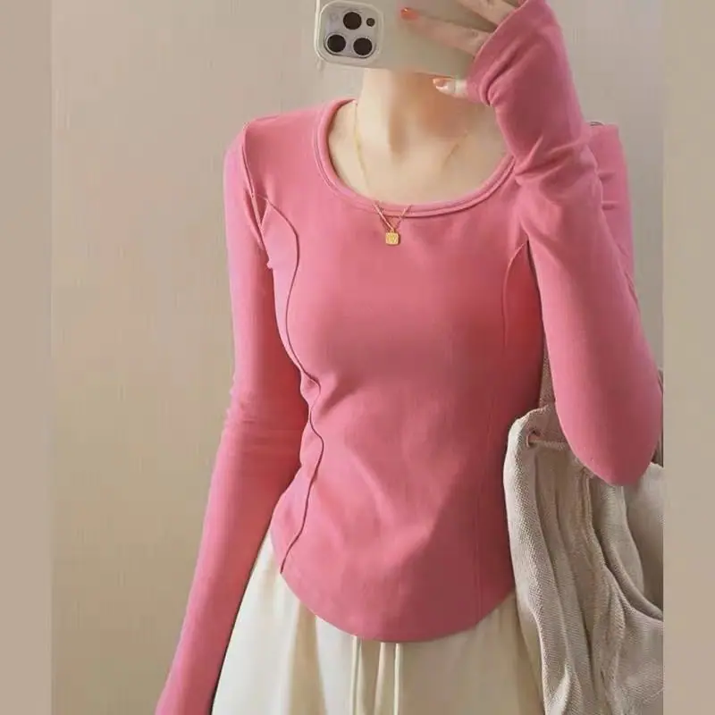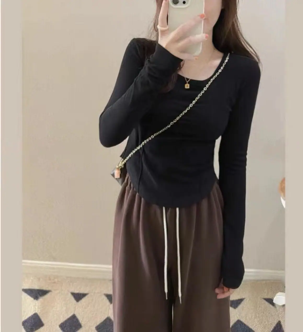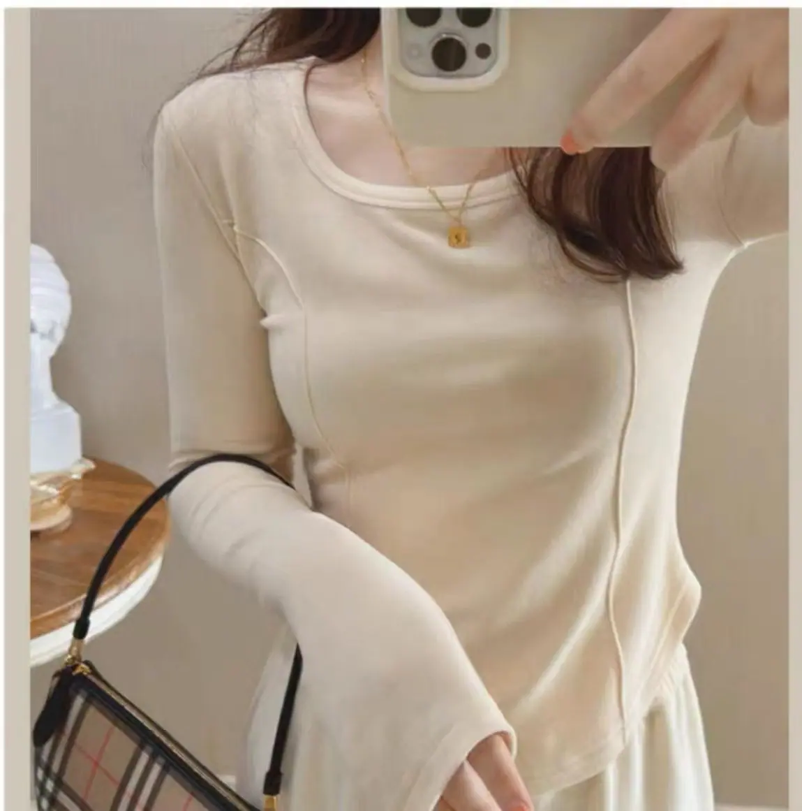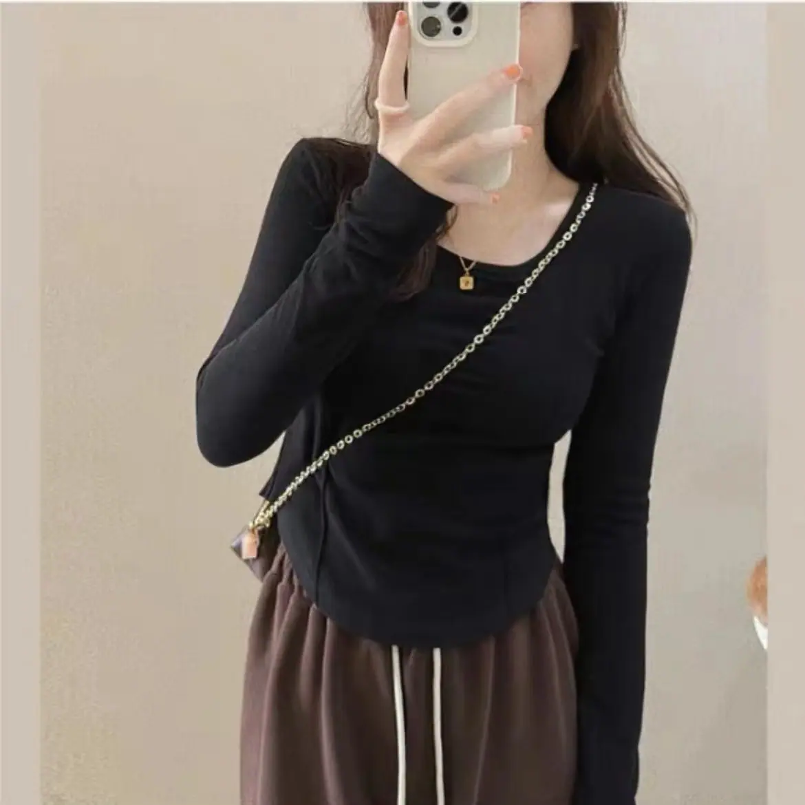 Nova Camiseta Feminina de Manga Longa com Design Espinha de Peixe de Primavera e Outono Algodão Puro Camada Base Decote Quadrado Ajuste Slim Roupa Íntima Top Curto
