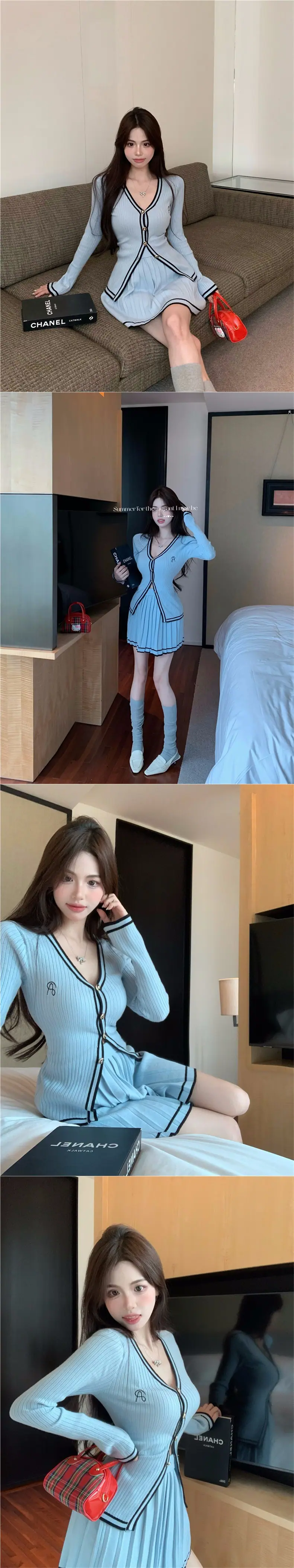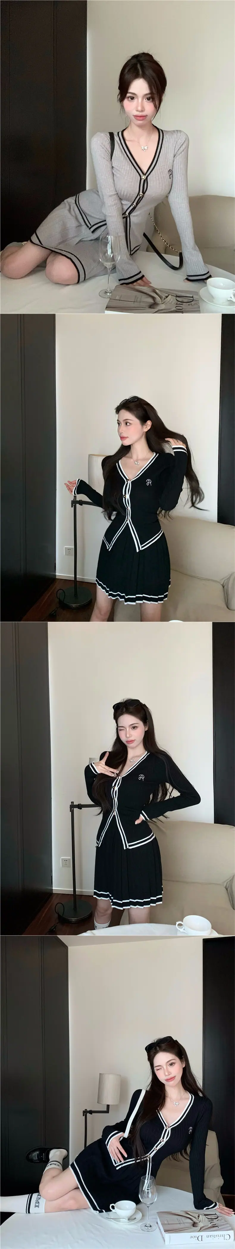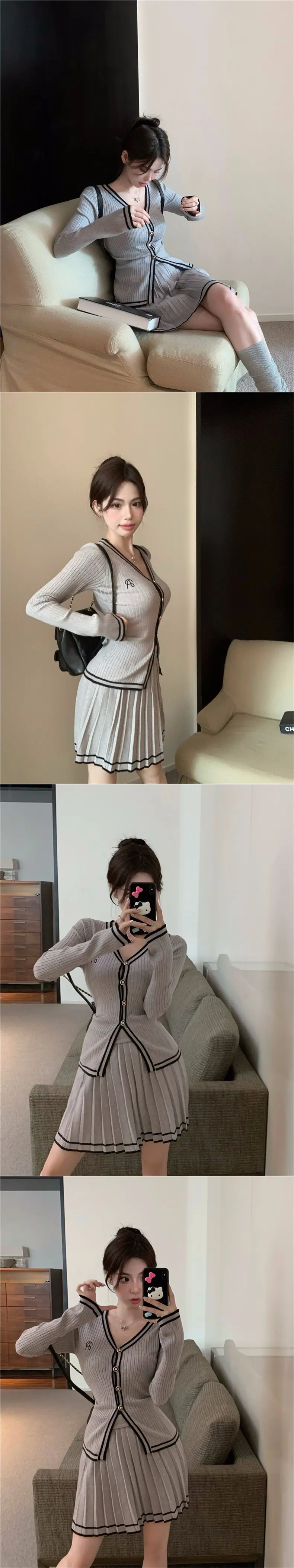 3856# Conjunto Puro e Sexy Cardigã Tricotado Slim Fit de Manga Longa Top Mulher Outono Saia Midi Plissada Temperamento Conjunto Duas Peças