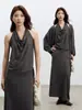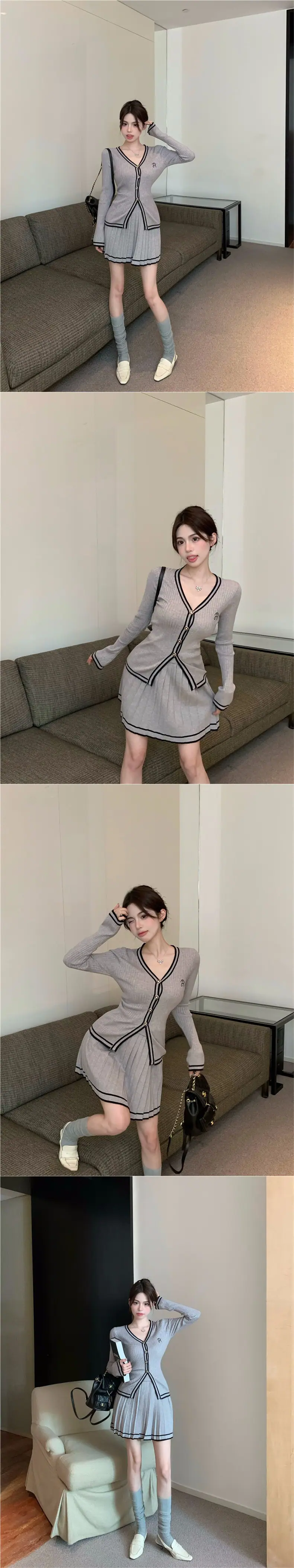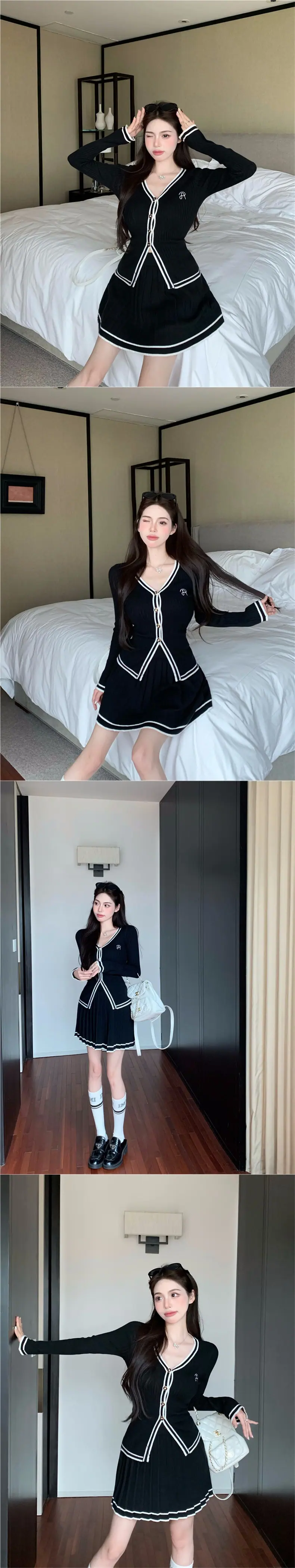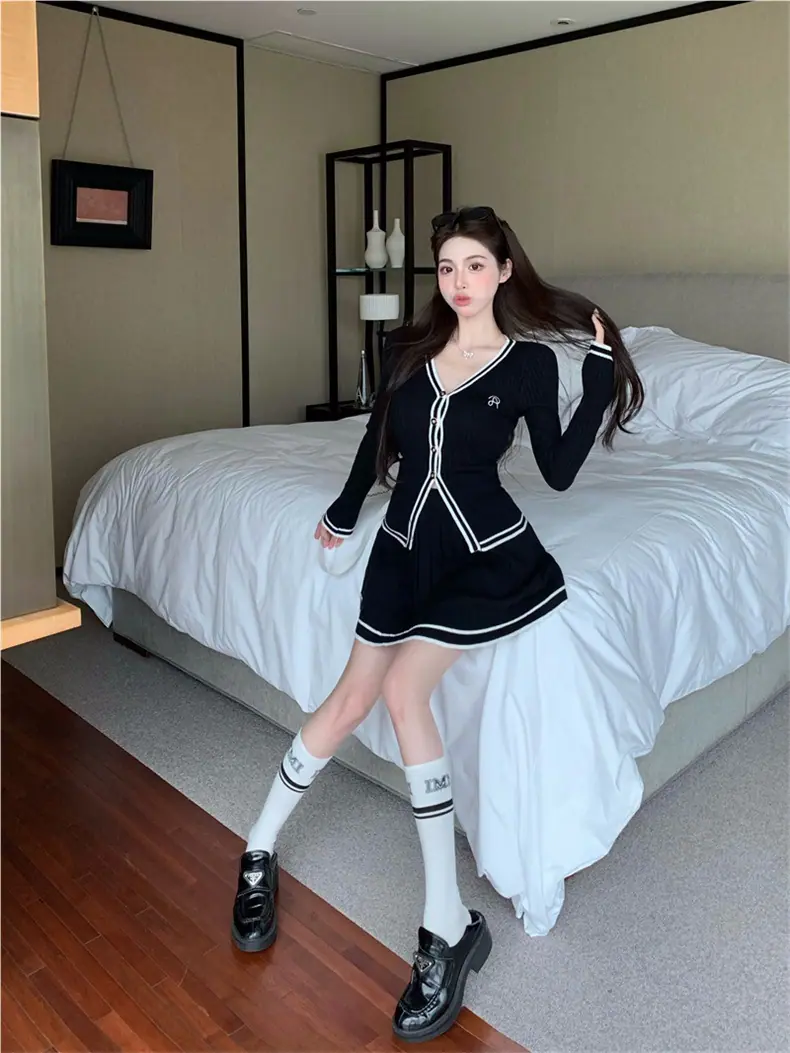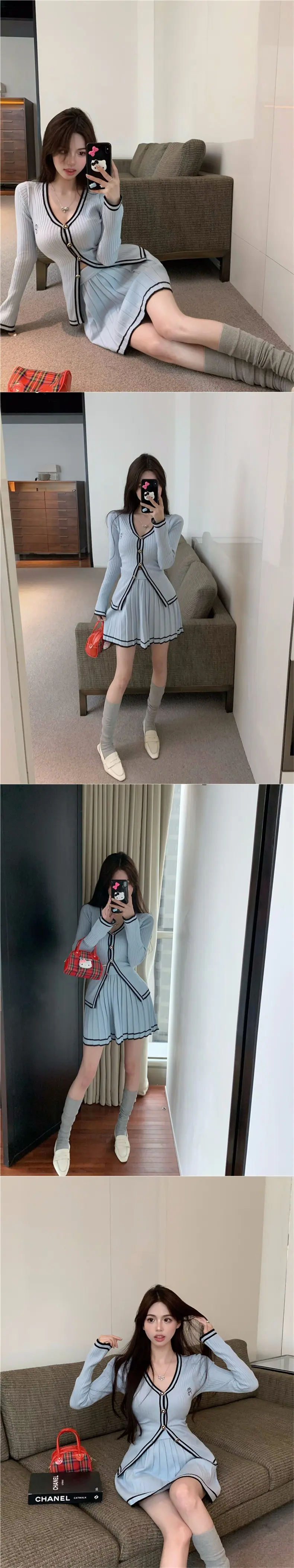 3856# Conjunto Puro e Sexy Cardigã Tricotado Slim Fit de Manga Longa Top Mulher Outono Saia Midi Plissada Temperamento Conjunto Duas Peças