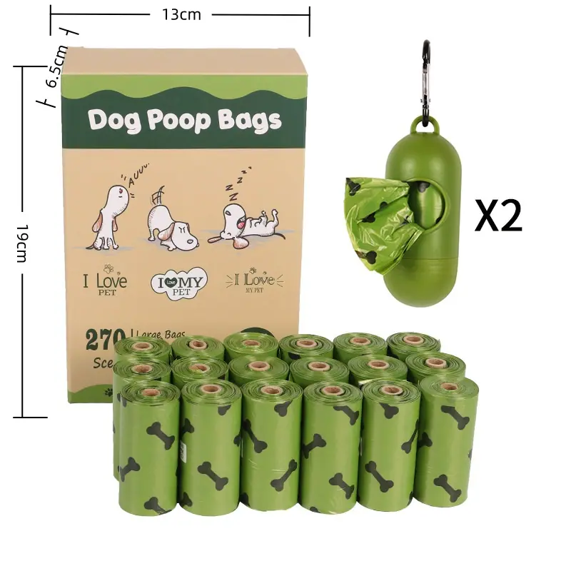 Cor: como a imagem principal Sacos Biodegradáveis para Resíduos de Animais de Estimação, Sacos para Cocô de Gato e Cachorro com Dispensador de Sacos para Cocô Sujeito ao estilo mostrado na imagem. Especificações do Saco de Lixo (Comprimento *Largura*Espessura) 230*330*0.013 mm 15 sacos por rolo, 18 rolos e 2 dispensadores de sacos para cocô por caixa, 20 caixas por caixa de papelão Material: PEAD+EPI Aroma: Lavanda Mecanismo de biodegradação: Degradação fotoquímica dentro de 1-2 anos após o descarte