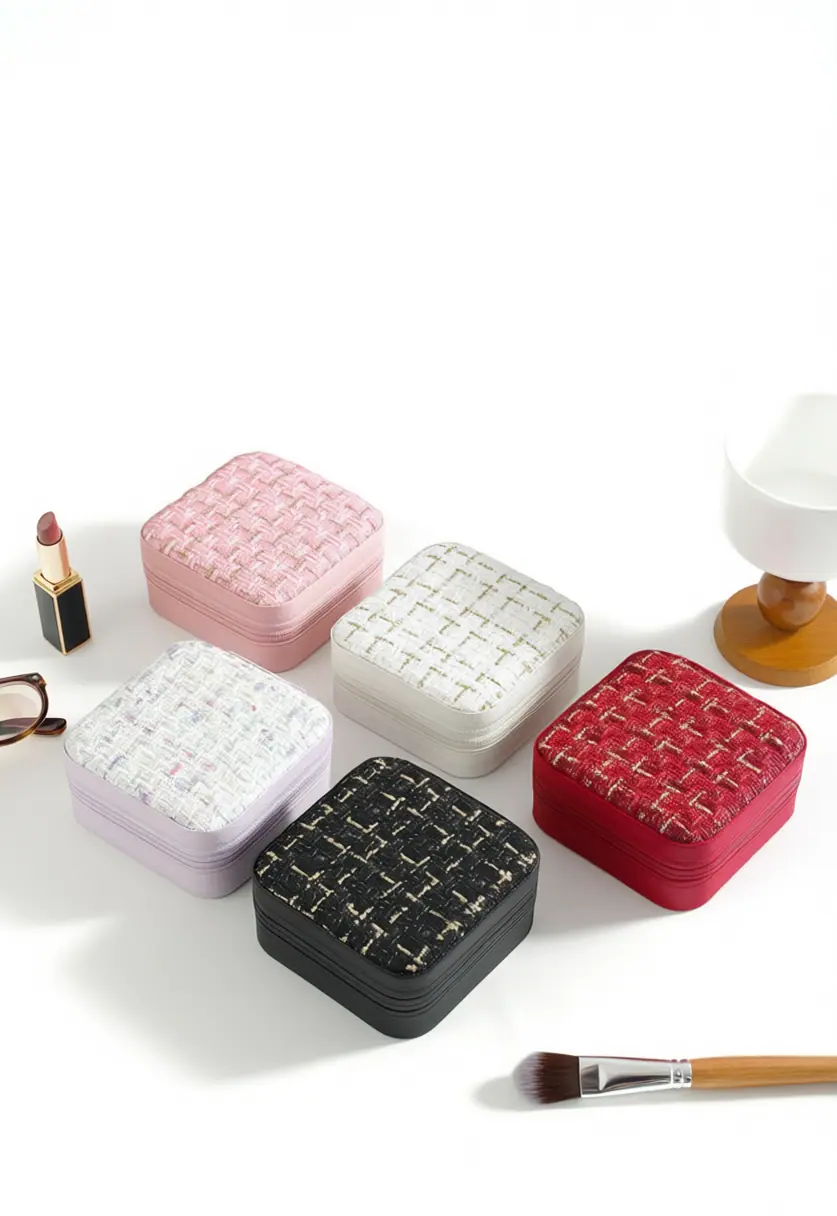Esta caixa de armazenamento de joias compacta é projetada para viagens e uso diário, apresentando um design simples e elegante.. Feito de materiais PU e poliéster de alta qualidade, inclui um forro interno macio e zíper suave para fácil acesso e proteção.. A caixa possui vários compartimentos para organizar brincos, anéis, colares e outros pequenos acessórios, evitando emaranhados e danos.