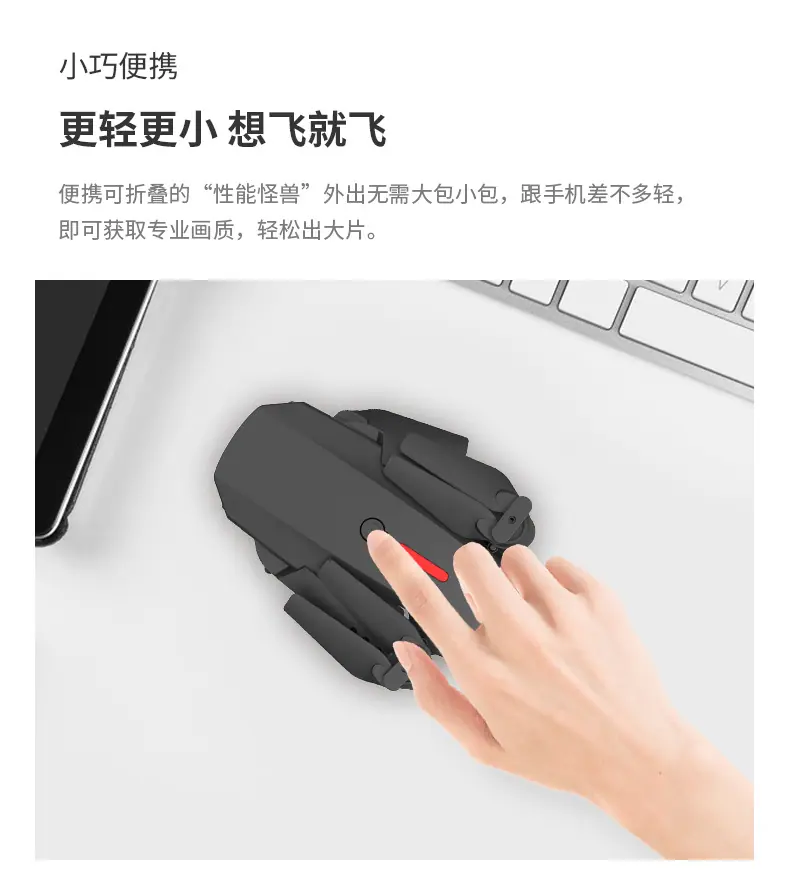 Funções: Dobrável, Altitude hold por pressão de ar, Bateria 3.7V 1600mAh, Decolagem com uma tecla, Pouso com uma tecla, Fotografia aérea 4K, Modo sem cabeça, Retorno com uma tecla, 3 velocidades ajustáveis: Lenta, Média, Rápida, Distância de transmissão de imagem 50-80 metros. Distância de controle remoto 80-100 metros.
