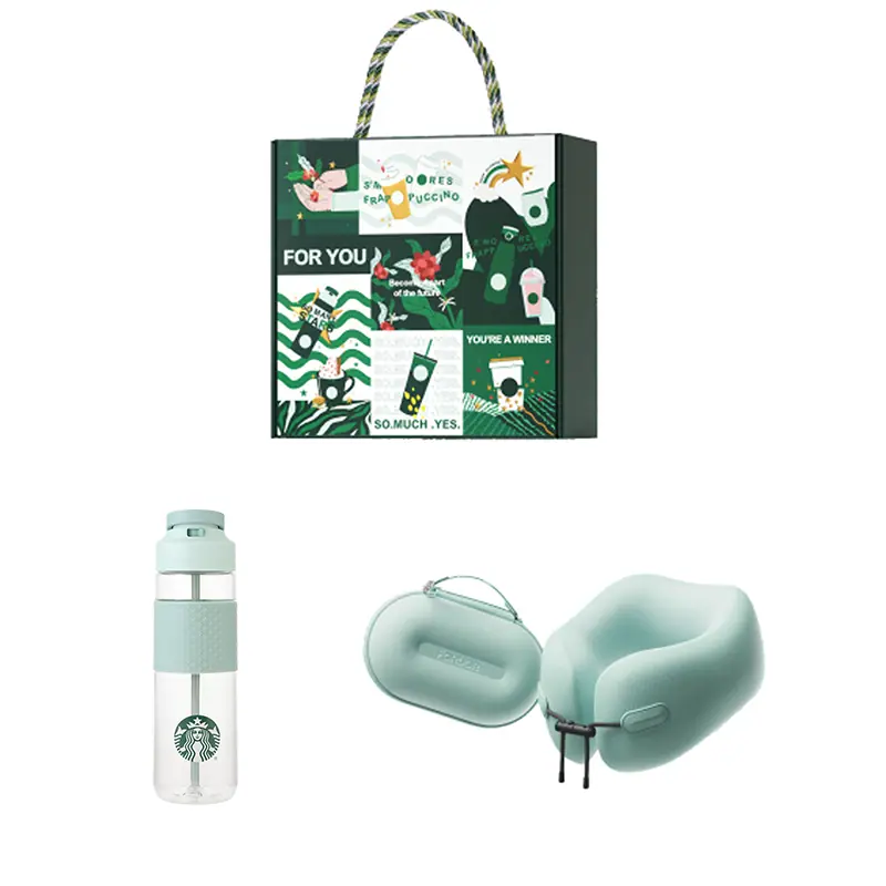 Caixa de presente Starbucks, que inclui um copo Starbucks para levar bebidas e café, e uma almofada para relaxar durante os intervalos.