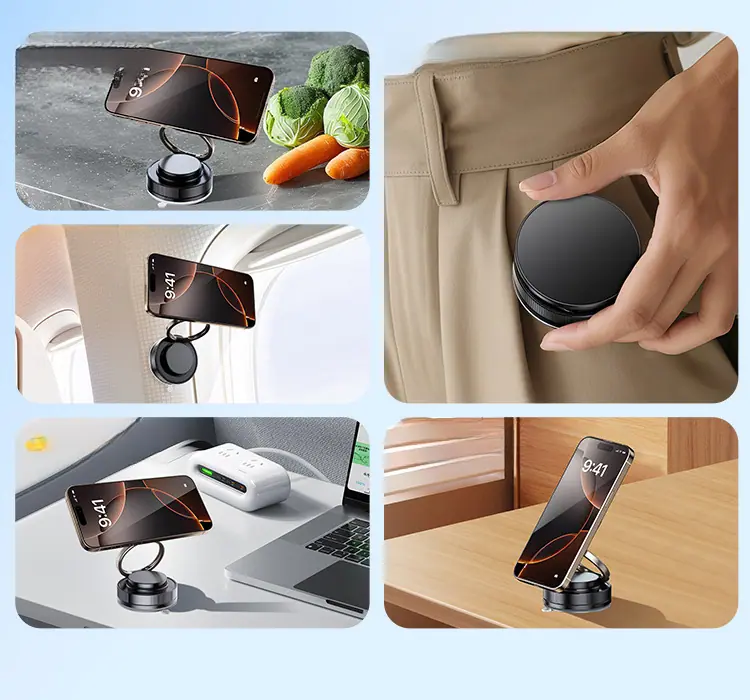 Experimente a máxima conveniência com nosso poderoso suporte magnético para celular para carro com tecnologia de sucção a vácuo! Este suporte inovador combina um ímã de neodímio super forte com uma base de sucção a vácuo confiável, criando uma fixação excepcionalmente segura para o painel do seu veículo ou console central.. A placa magnética fixa-se discretamente ao seu telefone ou capa, permitindo encaixe e liberação instantâneos com uma mão - sem necessidade de grampos ou ajustes.. A ventosa de vácuo garante uma aderência sólida em superfícies texturizadas ou lisas sem deixar resíduos. A junta esférica de 360 graus permite ângulos de visão perfeitos para navegação, videochamadas ou streaming de mídia.. A instalação leva segundos: limpe a superfície, pressione a ventosa e trave a alavanca. Ideal para passageiros diários, motoristas de carona compartilhada e entusiastas de viagens rodoviárias que buscam uma solução elegante e minimalista para segurança ao dirigir com as mãos livres.. A construção durável suporta temperaturas extremas e vibrações, tornando-o seu companheiro confiável para cada jornada.