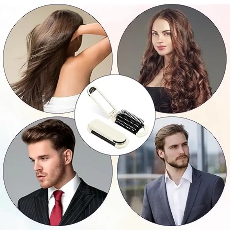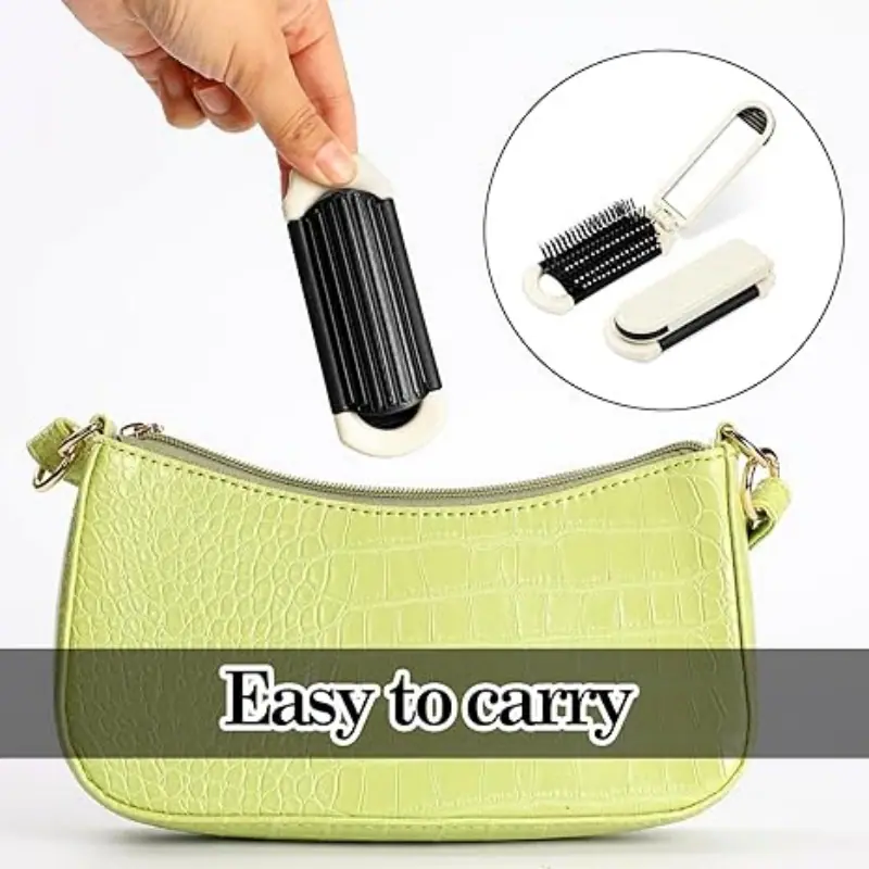 Materiais finos: A escova de cabelo dobrável é feita de ABS, tornando-a segura e confiável; a escova compacta tem muitas pontas macias e arredondadas que massageiam o couro cabeludo; também vem com um espelho, permitindo que você penteie o cabelo e aplique maquiagem a qualquer momento.
