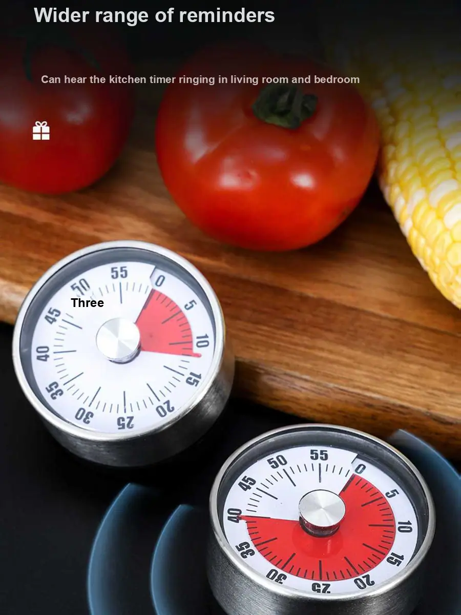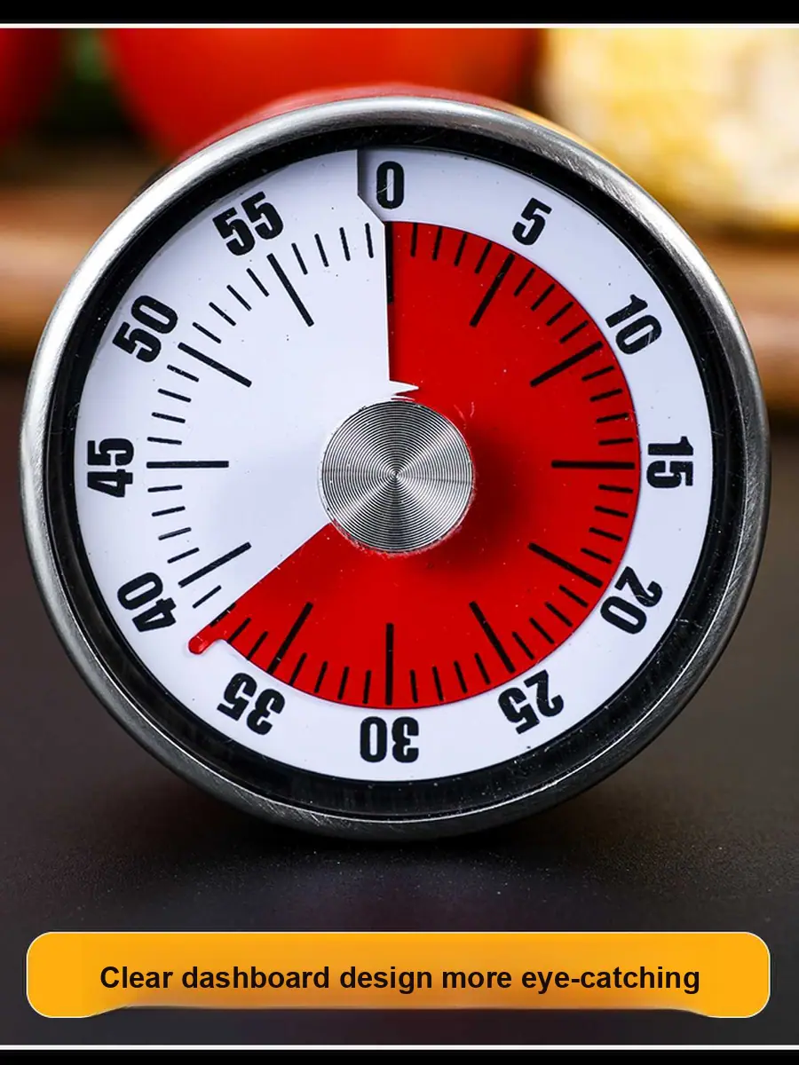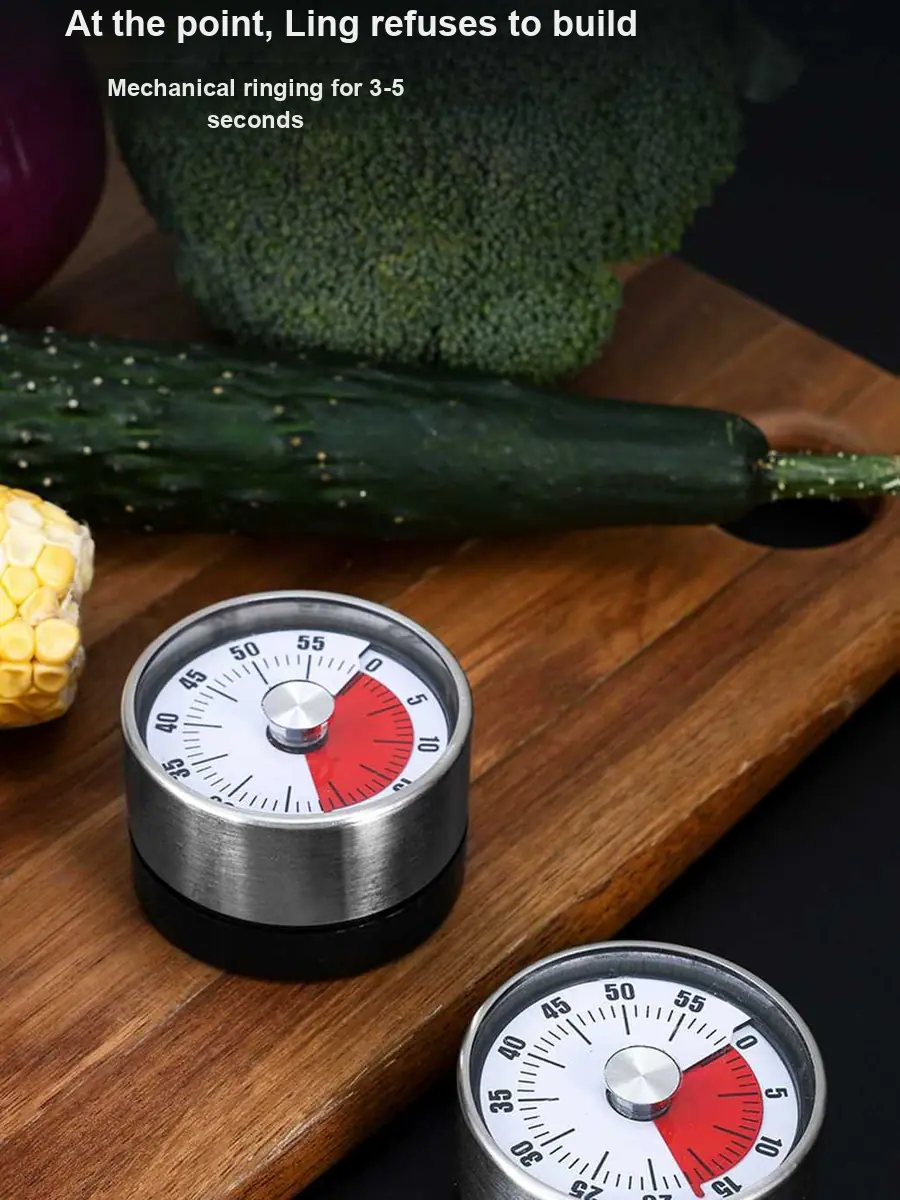 Este timer de cozinha mecânico apresenta uma construção em aço inoxidável e fundo magnético, tornando-o durável e fácil de fixar em geladeiras ou superfícies metálicas. Sua operação simples de torção permite um gerenciamento de tempo rápido e preciso, ideal para cozinhar, assar ou cronometrar sessões de estudo.. O design clássico garante uso duradouro sem a necessidade de baterias.