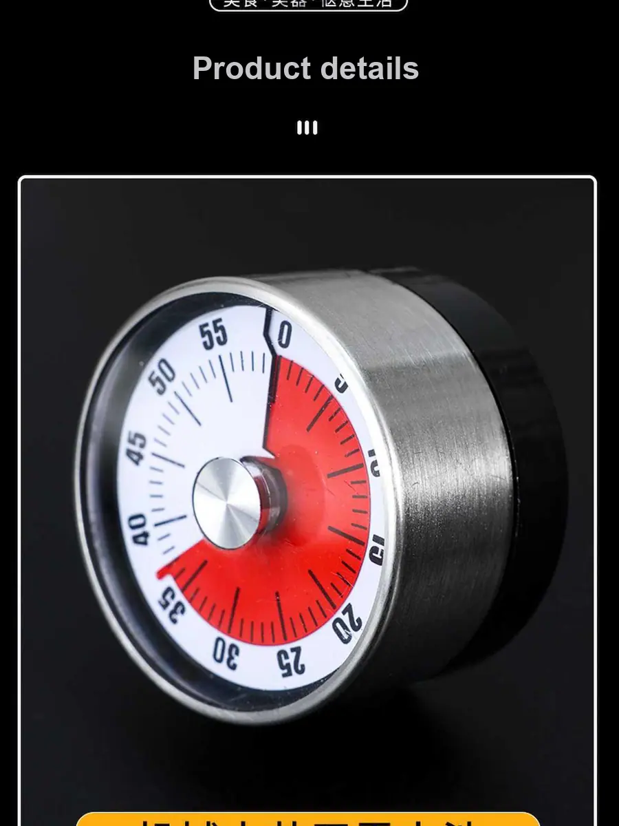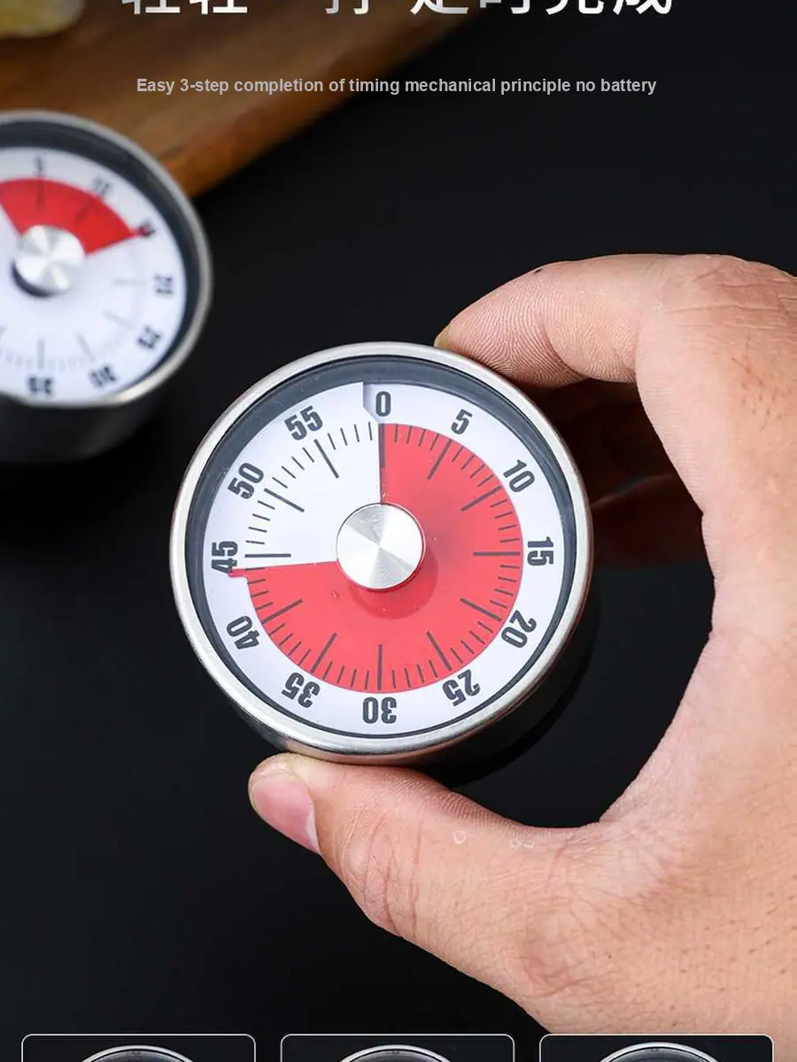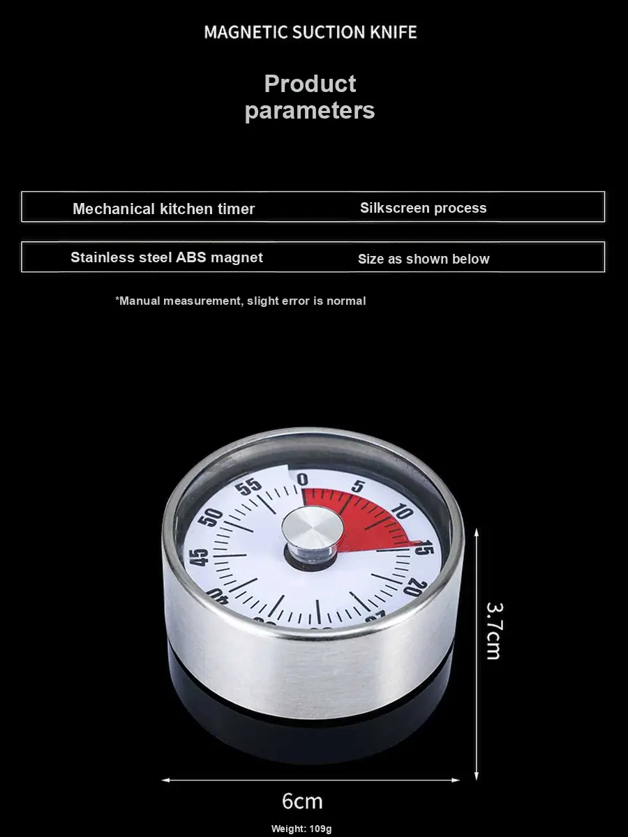 Este timer de cozinha mecânico apresenta uma construção em aço inoxidável e fundo magnético, tornando-o durável e fácil de fixar em geladeiras ou superfícies metálicas. Sua operação simples de torção permite um gerenciamento de tempo rápido e preciso, ideal para cozinhar, assar ou cronometrar sessões de estudo.. O design clássico garante uso duradouro sem a necessidade de baterias.
