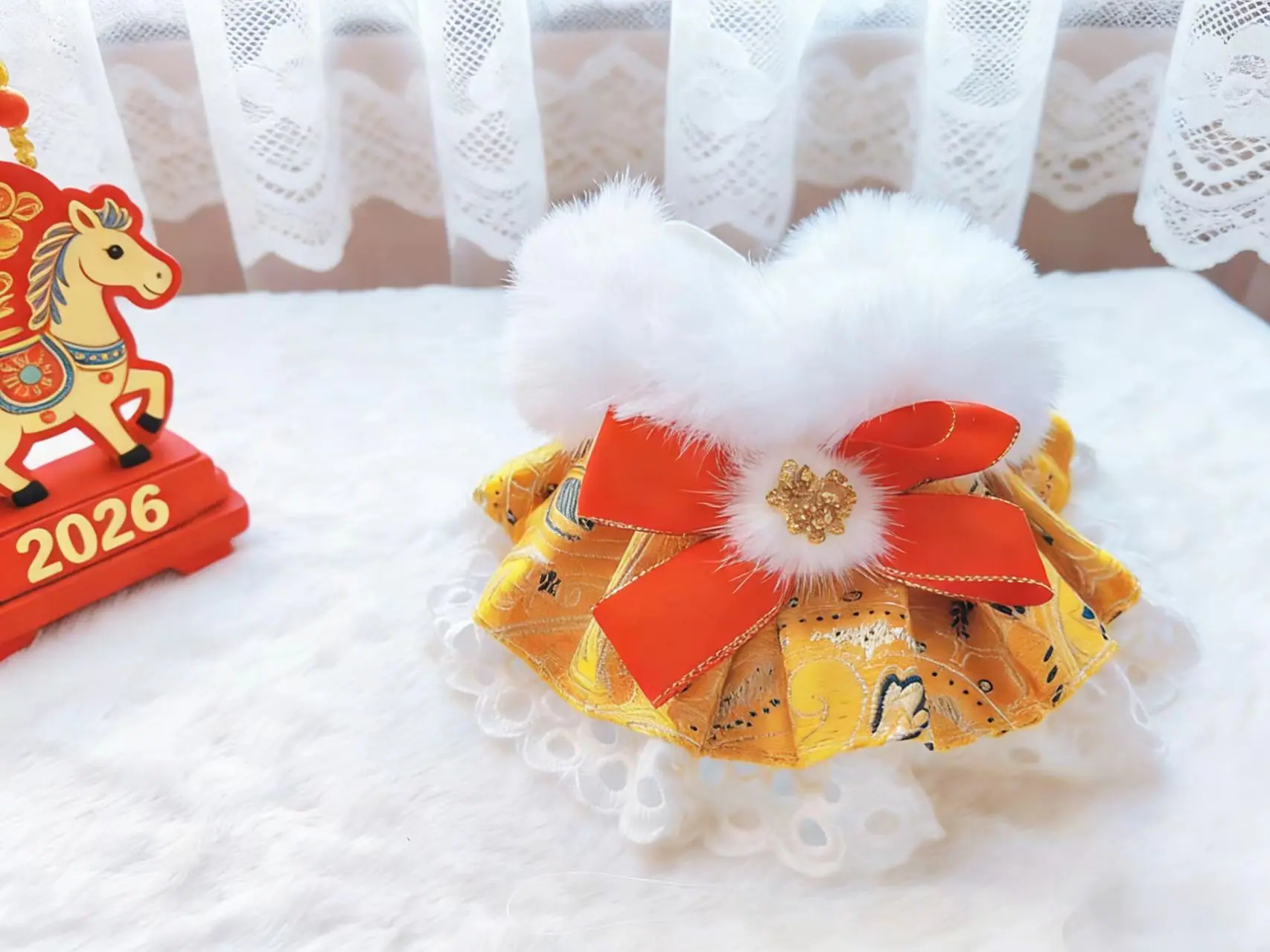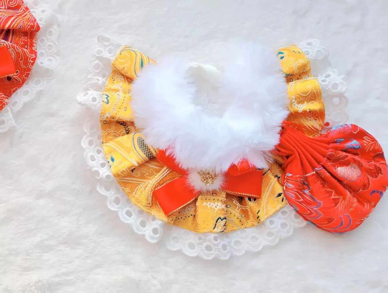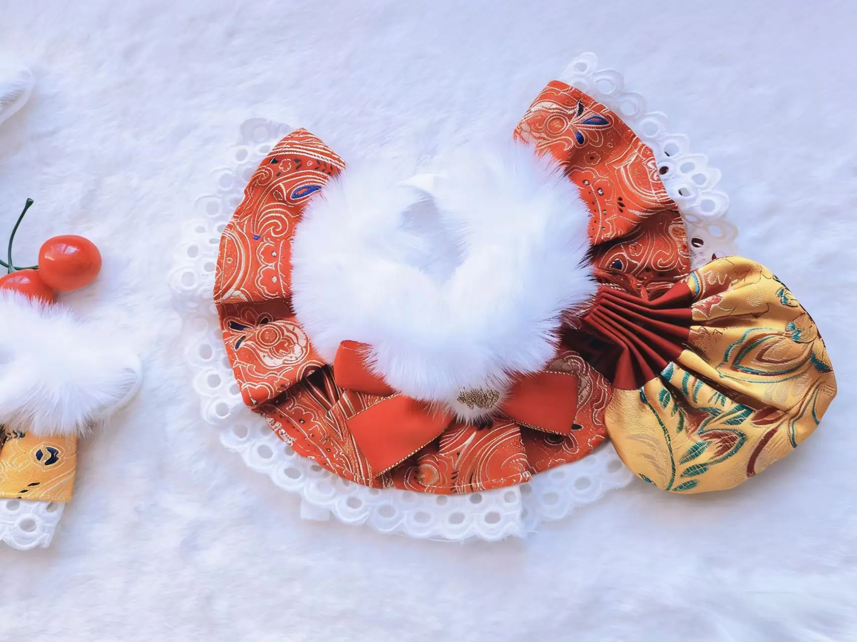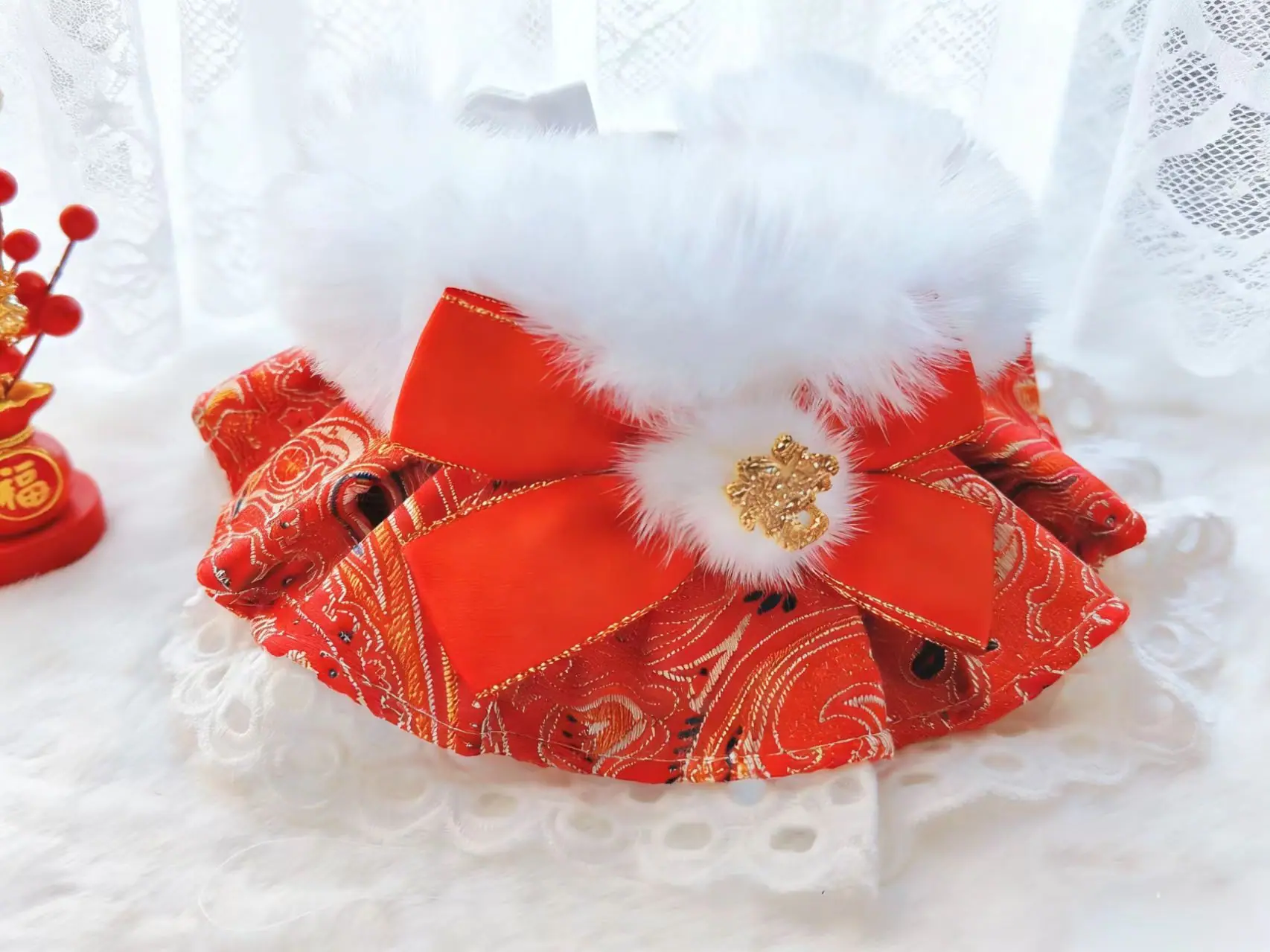 Novo Design Estético de Estilo Chinês Combinando o charme oriental tradicional com a moda pet moderna, adota um luxuoso tecido brocado vermelho adornado com padrões de fênix dourada, combinado com acabamento de pele sintética branca fofa e um grande laço de cetim.