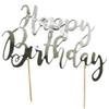Inserção de bolo de feliz aniversário prateada reflexiva de um lado, bandeiras de feliz aniversário cortadas a laser em estoque