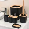 Conjunto de Lavagem com Tampa de Bambu para Banheiro Pronto para Exportação Caixa de Sabão Doméstica Pronta Porta-Escova de Dentes Frasco de Loção Lixeira Copo para Enxaguante Bucal