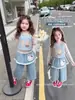 Roupa Infantil Coreana 2025 Novo Verão Regata Azul com Boneca Camiseta Infantil Combinação com Shorts Brancos Versátil Conjunto de Duas Peças
