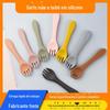 Garfo e Colher de Silicone Macio para Bebê de Grau Alimentício Transfronteiriço Talheres para Alimentos Complementares Bebê Aprendendo a Comer Garfo e Colher com Cabo de Madeira Alimentação Infantil