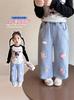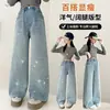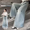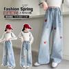 Calça Jeans Estilo Coreano para Meninas 2026 Primavera Nova Moda Casual Bordado com Toalha Crianças Médias e Grandes Calça Wide Leg Solta Tendência