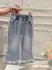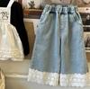 Roupas Coreanas Infantis para Meninas Cor Creme Primavera 2025 Jeans para Crianças Pequenas e Meninas com Renda, Estilo Casual Coreano de Perna Reta