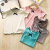 Camiseta de Verão com Laço Manga Curta Feminina Gola Redonda Casaco Casual para Crianças Pequenas e Médias Estilo Coreano com Orelhas Casual Infantil para Menina