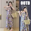 Maternidade 2025 Verão Novo Estilo Temperamento Pintura a Óleo Ombro Único Gola Redonda Solto Plus Size Vestido Longo para Gestantes