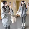 Jaqueta de maternidade 2025 Inverno Nova Moda Clássica Listrada Solta com Capuz e Gola de Pele Sintética Versátil Suéter Grosso