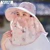 Novo chapéu de sol feminino de verão, chapéu de proteção solar, aba grande, cobertura facial para bicicleta, chapéu anti-ultravioleta para colheita de chá, chapéu de sol estampado