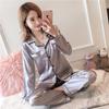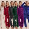 Comércio exterior europeu e americano casa usar lapela gelo seda pijamas terno feminino calças de manga comprida conjunto de duas peças plus size cetim fornecimento