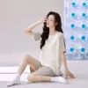 Conjunto de Pijama Feminino Europeu e Americano Transfronteiriço de Verão de Seda Gelo Básico de Manga Curta e Shorts para Uso Doméstico