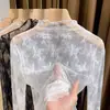 Camisa de quatro olhos com estampa de resina da moda, botões, camisa de chiffon com protetor solar, botões combinados, punho decorativo