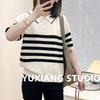 Top Tricotado de Manga Curta com Colarinho Polo e Decote em V, Estilo Francês, Design de Nicho de Início de Outono, Fresco, Colorido Listrado, para Mulheres