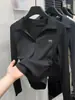 Camiseta de Algodão Puro com Gola Polo Bordada e Manga Longa para Mulheres Outono e Inverno Pequenas Pregas Gola Polo Camada Base Tendência Ins