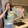 Camiseta Retrô Americana de Ombro Manga Curta Feminina Verão Gola Polo Xadrez Suéter Tricotado Moda Estilo Ocidental Doce e Apimentado Top