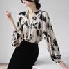 Camisa de cetim com estampa de tinta retrô francesa feminina 2023 início da primavera novo nicho com decote em V pulôver manga bufante top