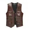 Colete Masculino Camada Superior Couro Genuíno Colete de Repórter Jaqueta Sem Mangas de Pesca Aquecida para Exterior Outono Inverno Meia-Idade Idoso Multi-Bolsos Roupa de Pai Marrom