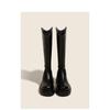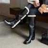Botas Pretas de Salto Grosso e Solado Grosso Acima do Joelho para Mulheres 2025 Novo Verão Estilo Britânico Botas de Cavaleiro Cowboy Ocidental