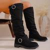 Botas Arredondadas Plissadas Estilo Novo Outono/Inverno 2025 para Mulheres, Afinando Salto Bloco Solado Grosso Camurça Moda Botas de Equitação