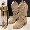Botas de cano médio estilo cowboy para mulheres, com bico fino, bordadas, estilo country, com salto grosso e tamanhos grandes.
