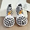 Um par de sapatos de palhaço quadrados em blocos de cores preto e branco, adequados como acessórios de fantasia para Halloween, Carnaval e COSPLAY de palhaço