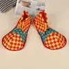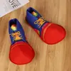 Um par de sapatos de palhaço coloridos com pontas vermelhas, ideal como acessórios de fantasia para Halloween, carnavais e cosplay de palhaço.