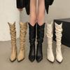 Botas de Cavaleiro Longas Plissadas com Salto Grosso Calçados Femininos 2025 Nova Primavera e Outono Botas Altas Slim Ocidentais