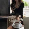 Outono Retrô Design Francês Sexy Veludo Tops Femininos Pequeno Cheiro V-Neck Renda Costura Camisa